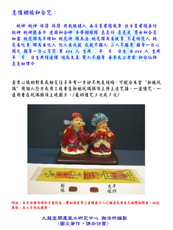 這法是由老師幫忙做法,持和合法咒語讓夫妻和合不分開,開離咒破壞外遇感情。